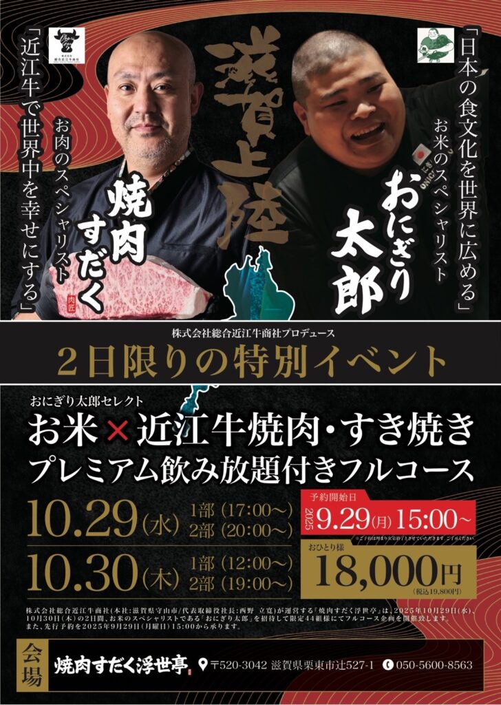 株式会社総合近江牛商社(本社:滋賀県守山市/代表取締役社長:西野 立寛)が運営する『焼肉すだく浮世亭』は、2025年10月29日(水)、10月30日(木)の2日間、お米のスペシャリストである「おにぎり太郎」を招待して限定44組様にてフルコース企画を開催致します。また、先行予約を2025年9月29日(月曜日)15:00から承ります。